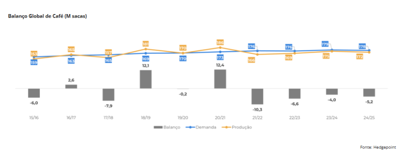 O ciclo 24/25 deve fechar com novo déficit, já que a demanda por café segue resiliente, enquanto problemas na produção global reduziram estoques a níveis historicamente baixos.