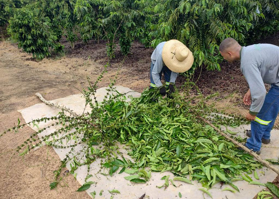Os dados usados na pesquisa foram coletados em campo. O estoque de carbono armazenado nas plantas foi gerado a partir das análises laboratoriais de amostras de cafeeiros adultos (foto acima – média de idade de oito anos) obtidas nas lavouras. Os dados das emissões foram levantados por meio da aplicação de questionários e em reuniões com produtores locais.