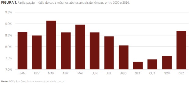 Com relação à cria, houve uma redução da rentabilidade, e 2018 deve ser um ano de aumento da oferta de fêmeas para abate, que normalmente chegam ao gancho em maior volume em março e maio. A figura 1 mostra a participação média de cada mês nos abates anuais de fêmeas, no período entre 2000 e 2016 (último ano completo de dados do IBGE).