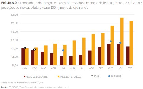 A figura 2 mostra a sazonalidade de preços, considerando a média de 2000 a 2017 para anos de retenção e de descarte de fêmeas.