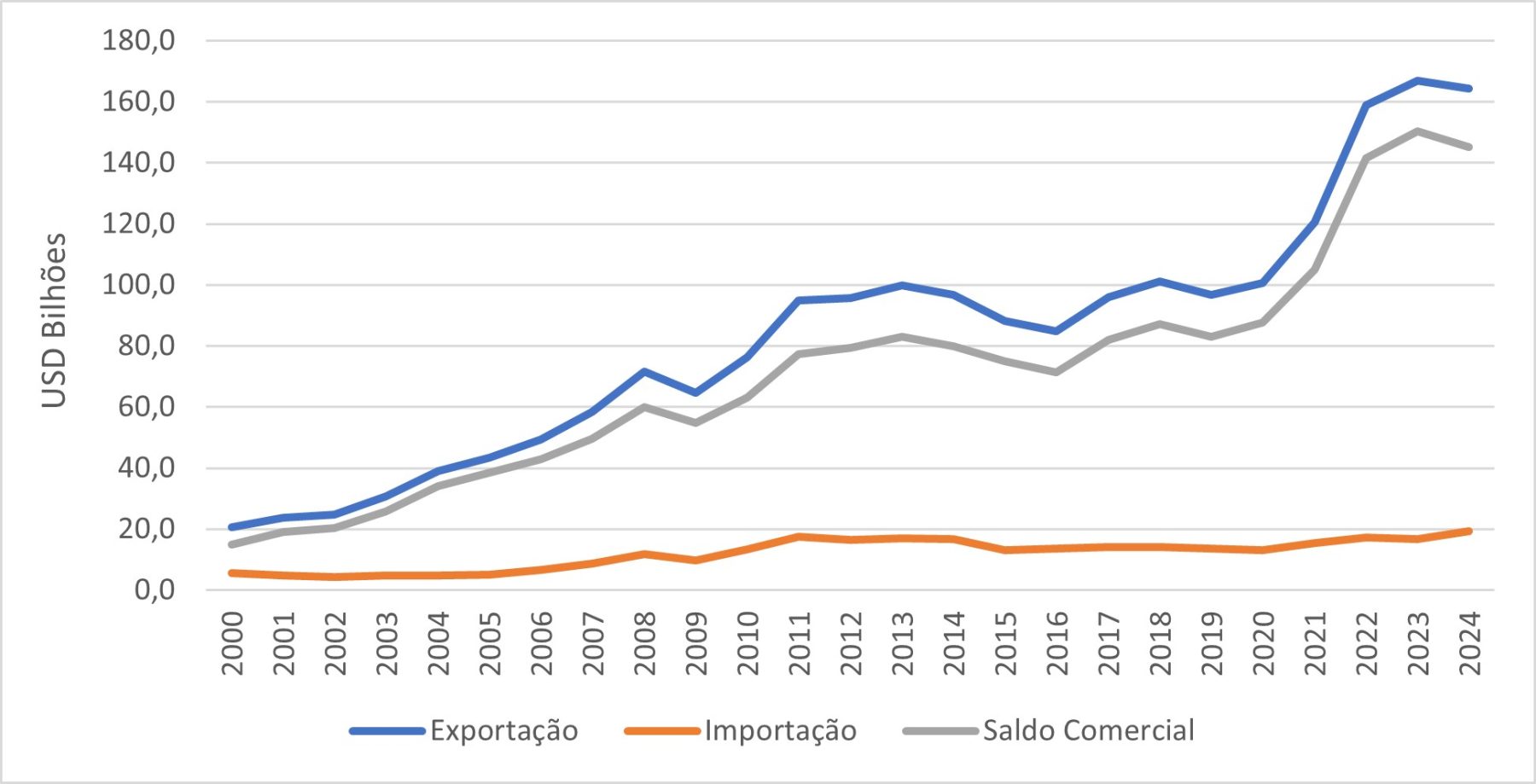 A figura 1 apresenta a balança comercial, em bilhões de dólares, no período de 2000 a 2024.