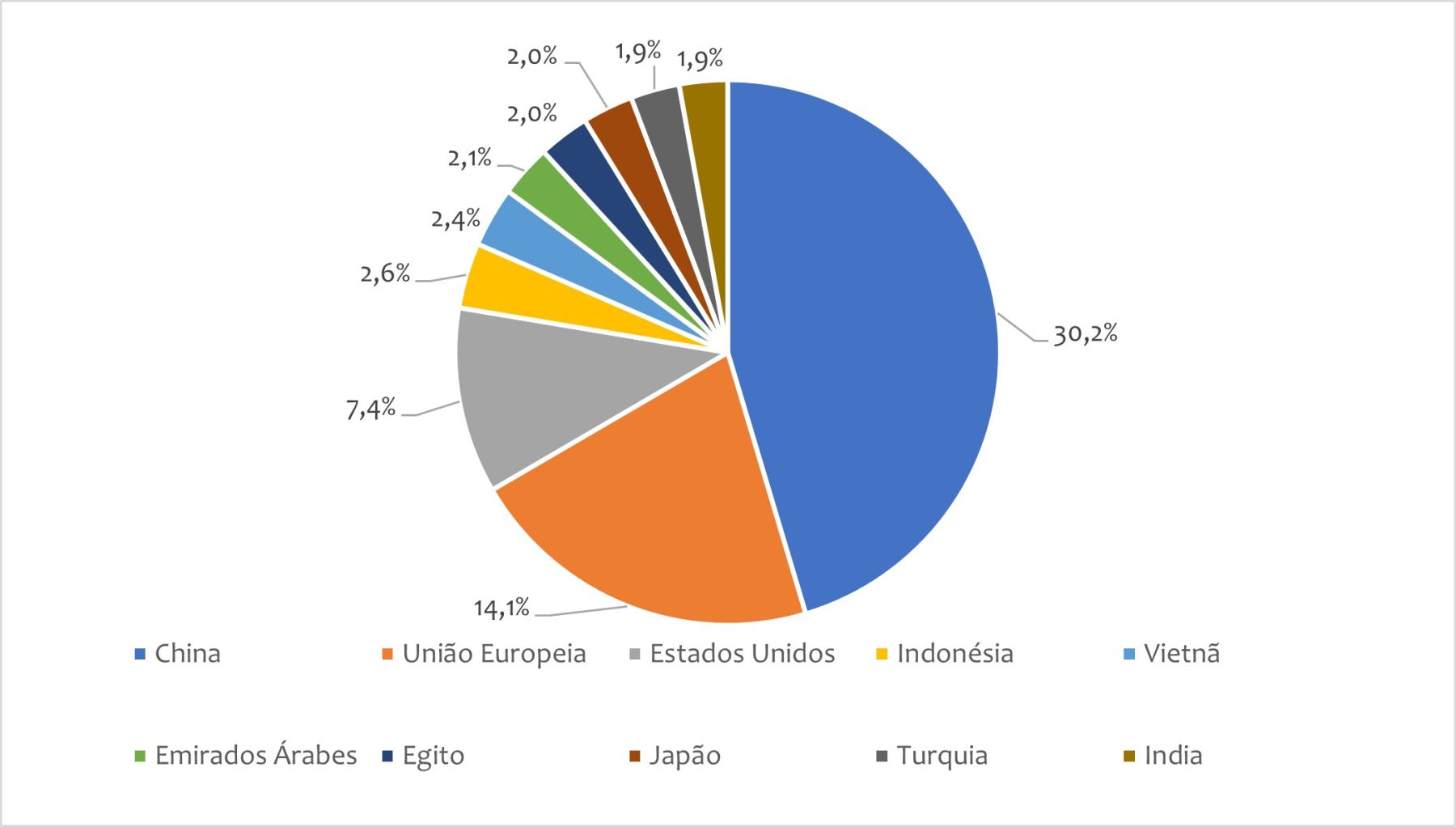 Quanto aos mercados de destino (figura 3), as exportações para a China apresentaram uma queda significativa de 16,4% em comparação ao ano anterior, totalizando US$10,5 bilhões. Esse declínio foi influenciado principalmente pela redução nas exportações de complexo soja e milho. Como resultado, a participação da China nas exportações do agronegócio brasileiro caiu de 36,2% para 30,2%.