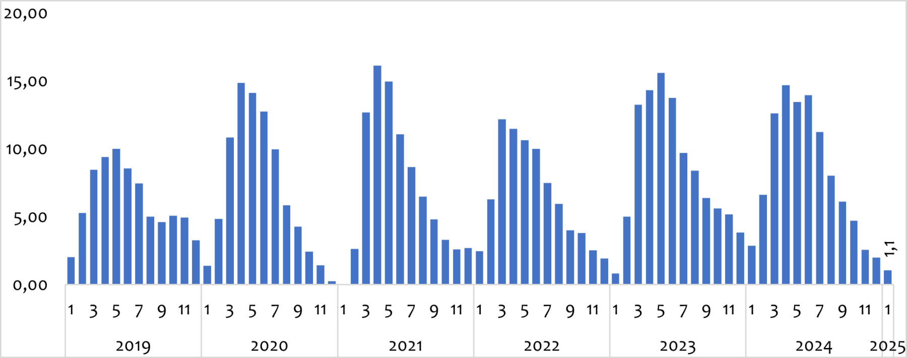 Em janeiro de 2025, a exportação brasileira perdeu força – tendo sido embarcadas 1,1 milhão de toneladas, volume bem abaixo da exportação registrada em janeiro de 2024 (2,9 milhões) – veja na figura 1.