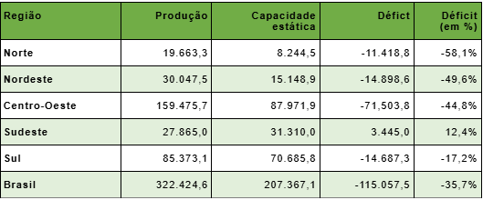 A capacidade de armazenamento de grãos, não acompanhou o crescimento da produção. Nos últimos 10 anos, a capacidade estática aumentou em 44,9 milhões de toneladas e a produção aumentou 113,8 milhões de toneladas (gráfico 1).