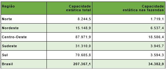 Capacidade estática total e capacidade estática em fazendas, em 2024, em mil toneladas.