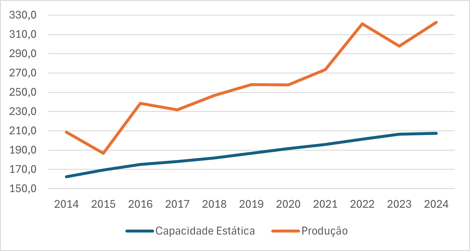 Evolução da capacidade estática de armazenamento e da produção de grãos, entre 2014 e 2024*, em milhões de toneladas.