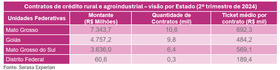 No cenário por Unidades Federativas (UFs) foi possível identificar que o Mato Grosso alcançou a maior quantia em concessão de crédito rural e agroindustrial para produtores rurais que atuam como pessoa física. O Estado marcou R$ 7.343,7 milhões, com cerca de 10,6 mil contratos que tinham um ticket médio de R$ 692,3 mil – maior que a média da região. Ainda assim, houve queda de 2,9% na comparação do montante geral (7,3 milhões) na avaliação trimestre contra trimestre (2024/23).