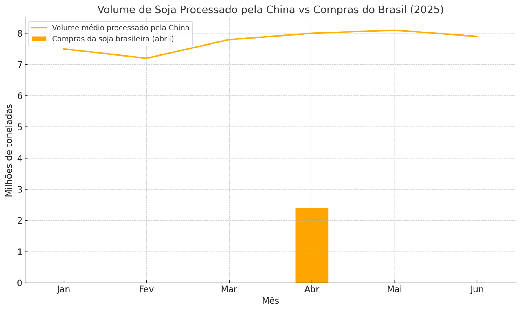 Abaixo, o gráfico compara o volume médio mensal de soja processado pela China em 2025 com o volume excepcional de compras brasileiras em abril: