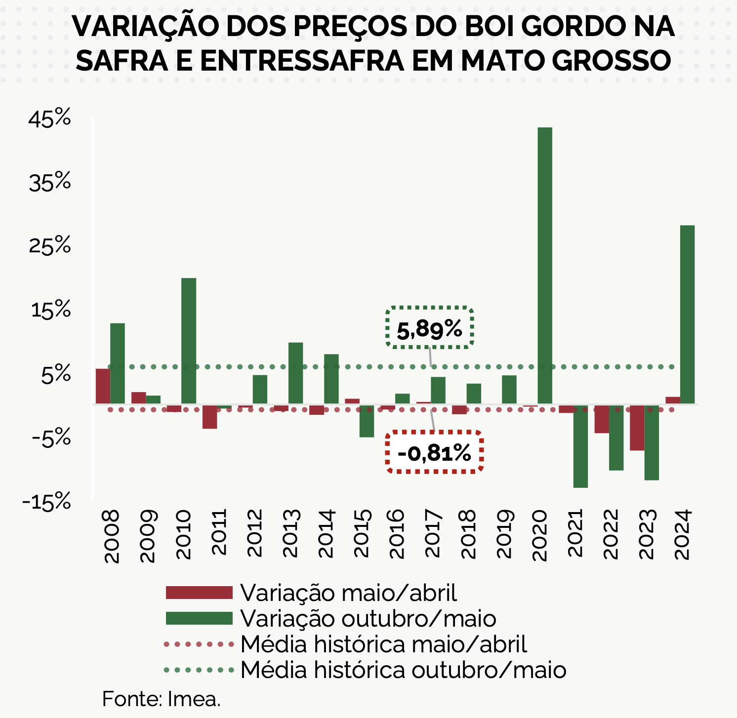 Segundo análise do Imea, os preços da arroba tendem a se recuperar a partir de outubro, quando comparados aos valores de maio. Na média histórica, o ganho registrado no período foi de 5,89%, o que sinaliza um possível cenário de valorização caso o ciclo siga o padrão dos últimos anos.