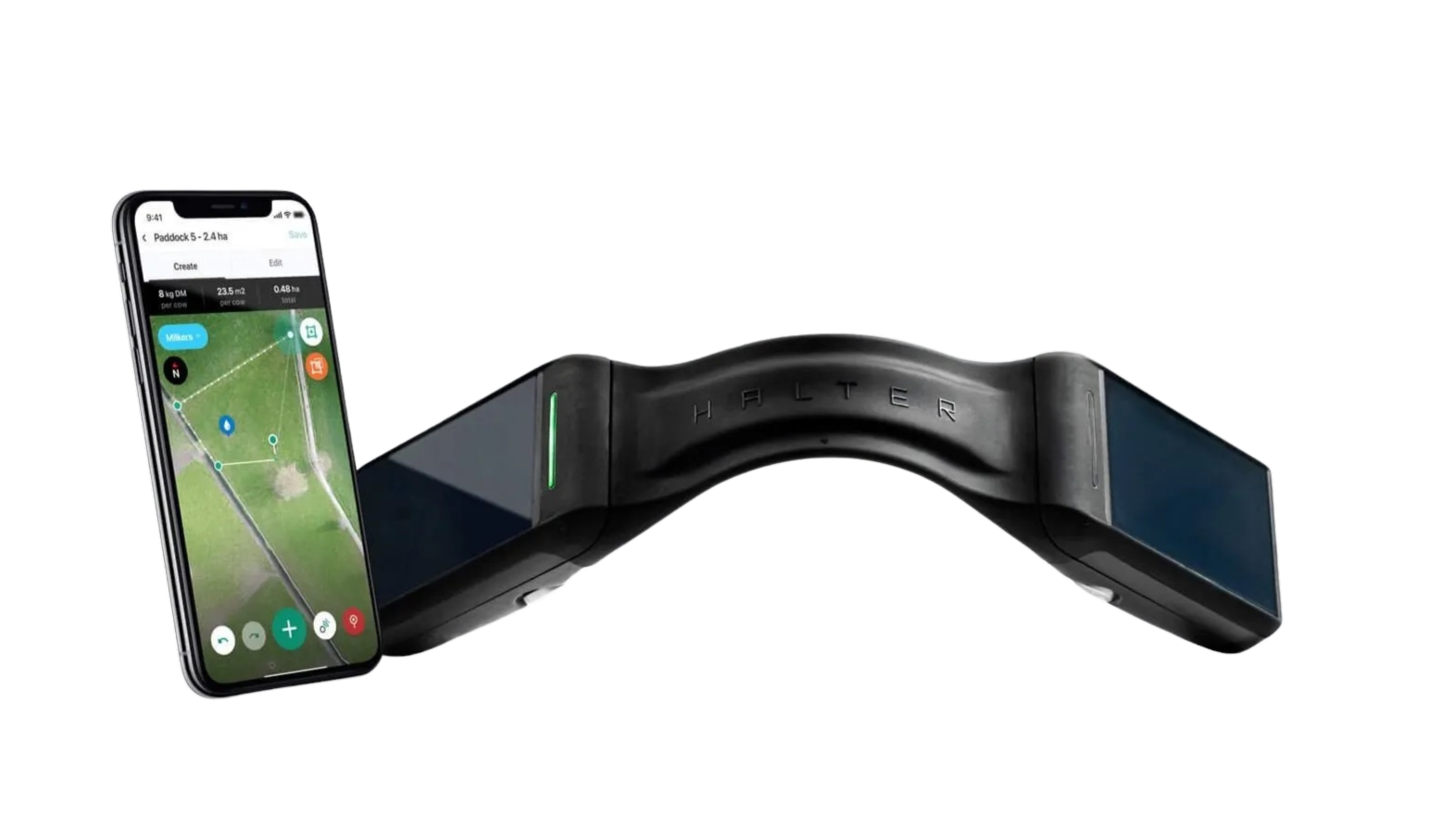 As coleiras desenvolvidas pela Halter são equipadas com GPS, sensores de movimento, painel solar e conectividade sem fio. Por meio de um aplicativo, o produtor cria áreas virtuais de pastejo e define limites invisíveis que orientam o deslocamento do rebanho.