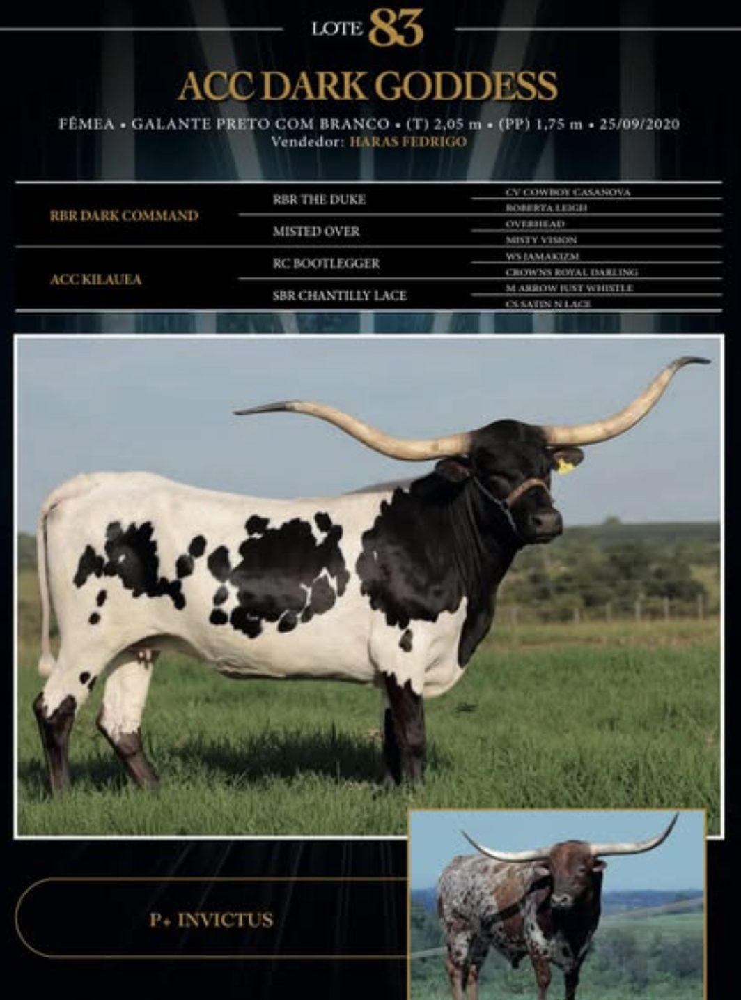 Outro destaque do evento é o Lote 83 – ACC Dark Goddess, uma fêmea nascida em 25 de setembro de 2020, com impressionantes 2,05 metros de ponta a ponta de chifre (T) e 1,75 metro de ponta a ponta de base (PP), ostentando a pelagem galante preto com branco. Filha do consagrado P+ Invictus, a doadora reúne elegância, força genética e estrutura impecável — atributos que reforçam o padrão de qualidade da seleção do Art Ranch. Esse lote especial também será ofertado neste domingo: