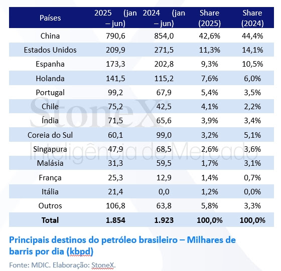 Na lista de compradores, a China segue como um dos principais destinos do petróleo brasileiro. Esse mercado representa 42,6% das exportações brasileiras, mantendo a Ásia como uma região estratégica para as vendas do Brasil, que responde por 56,2% do volume total exportado.