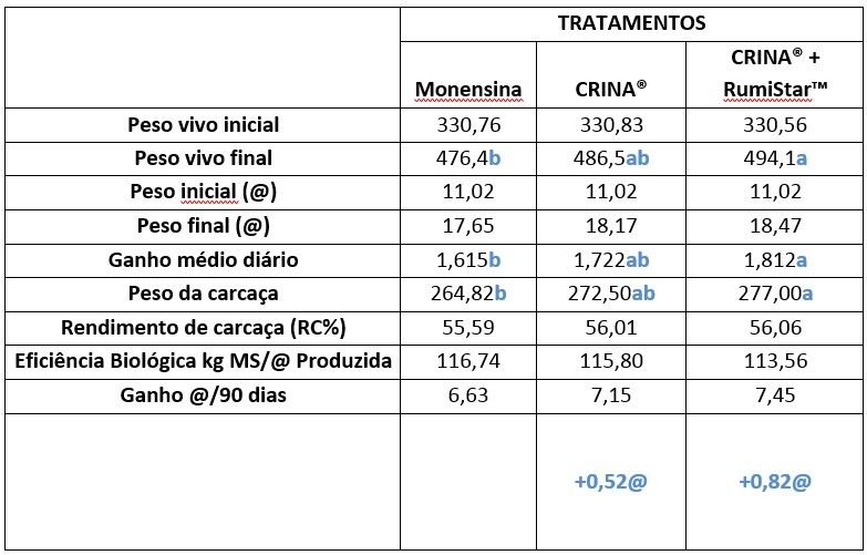 Estudos recentes na Escola Superior de Agronomia Luiz de Queiroz (ESALQ-USP) mostraram que a utilização dessas tecnologias (por 90 dias) aumentou o Ganho de Carcaça e consequentemente o rendimento de carcaça dos animais suplementados, conforme podemos visualizar na tabela abaixo: