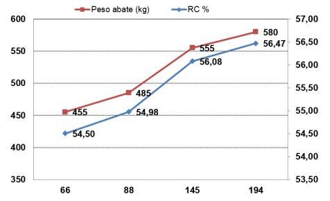 Há uma grande relação entre o peso vivo final e o rendimento de carcaça (RC%), sendo que a tendência é que animais abatidos mais pesados tendem a apresentar um maior rendimento de carcaça.