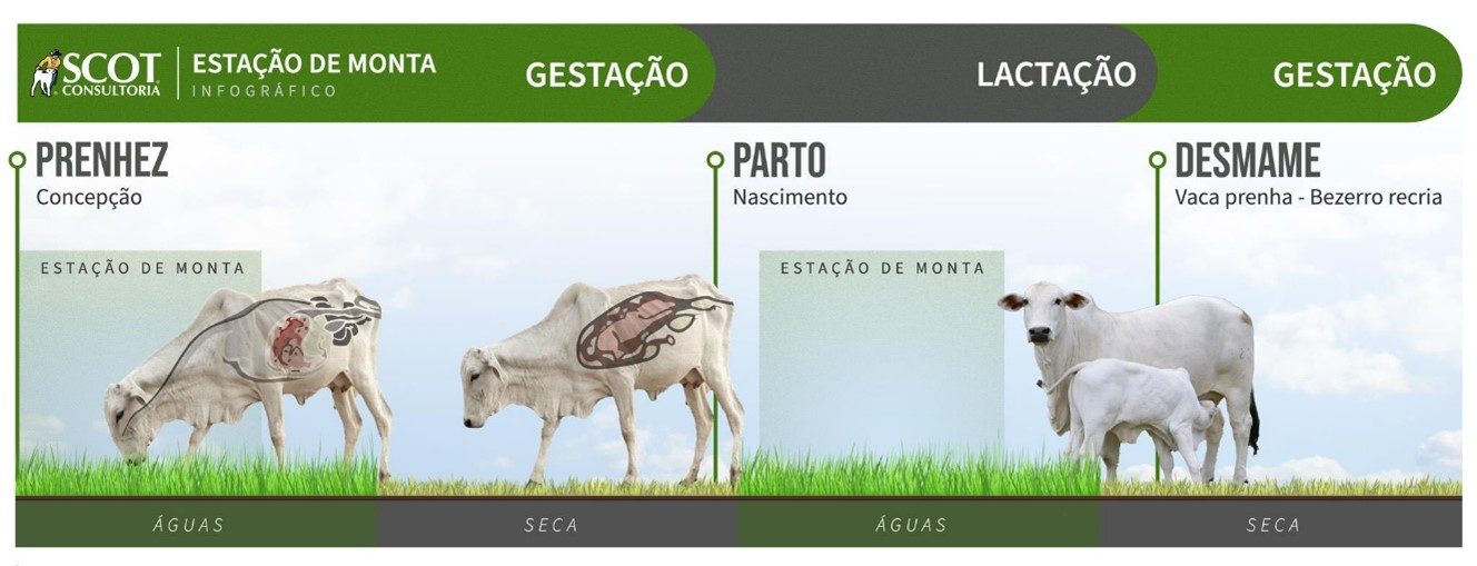 E qual o melhor momento para realizar a EM? Considerando as diferenças entre as regiões brasileiras quanto ao início e índices de chuvas, recomenda-se que a estação de monta seja estabelecida logo após um acúmulo de precipitação pluviométrica de oitenta a cem milímetros e recuperação das pastagens. Considerando que cada vaca deve produzir um bezerro no período de um ano, com a gestação de vacas durando entre 280 e 290, restam 75 dias para a involução uterina (aproximadamente 30 dias), retorno a ciclicidade e nova prenhez. Sendo assim, a recomendação é de que a EM tenha duração média de 90 dias. No caso das novilhas, a EM pode ser encurtada e ter início e final antecipados em relação ao das vacas (aproximadamente 45 dias).