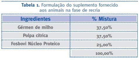Para esse tipo de suplementação, foi utilizado o Fosbovi Núcleo Proteico (indicado para o preparo de suplemento proteico e/ou energético, enriquecido com Minerais Tortuga – dentre eles o Cromo – e Monensina), misturado a gérmen de milho e polpa cítrica (Tabela 1).