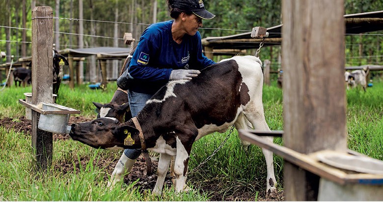 Os 80 funcionários da fazenda, que tem baixíssima rotatividade, são treinados em bem-estar animal. Duas vezes por ano, eles passam por curso de reciclagem. No bezerreiro, com capacidade para 500 animais, chama a atenção a atitude de Marluce Alves Pereira, responsável pelo setor há cinco anos.
