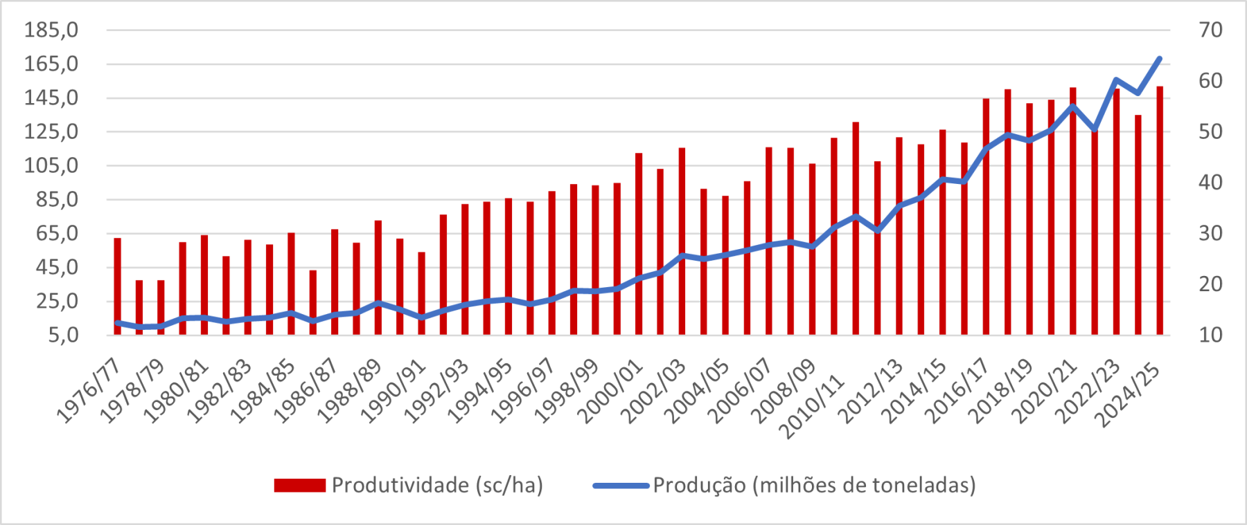 No eixo da esquerda, a produção brasileira de soja por safra, em milhões de toneladas; no eixo da direita, a produtividade da soja no Brasil, por safra, em sacas por hectare.
