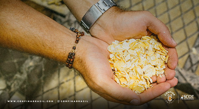 Nas Fazendas Conforto e Grande Lago, duas gigantes da pecuária, a floculação do milho é um dos destaques. A floculação do grão (steam flaking) é uma técnica de processamento físico muito utilizada na pecuária de corte para aumentar a digestibilidade do amido, principalmente em dietas de confinamentos norte-americanos, localizados em grandes regiões produtoras como “Corn Belt”.