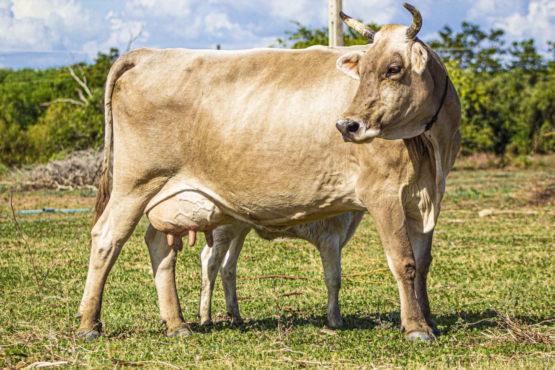 O Gado Caracu é uma raça de bovinos notável por sua pelagem castanha clara, que pode variar de um tom mais claro a marrom intenso. Os machos costumam pesar entre 700 e 900 kg, enquanto as fêmeas variam de 500 a 650 kg. Essa raça é conhecida pela sua docilidade, adaptabilidade e resistência a doenças, sendo especialmente bem adaptada ao clima quente e às pastagens de menor qualidade.