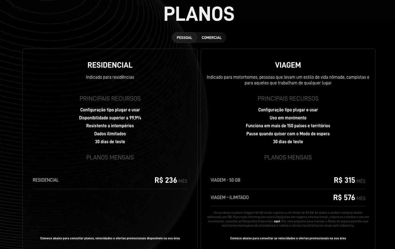 Além da antena, o plano contratado é decisivo. Apenas os planos itinerantes — conhecidos no Brasil como Starlink Roam ou plano Viagem — autorizam o uso fora do endereço fixo e em movimento.