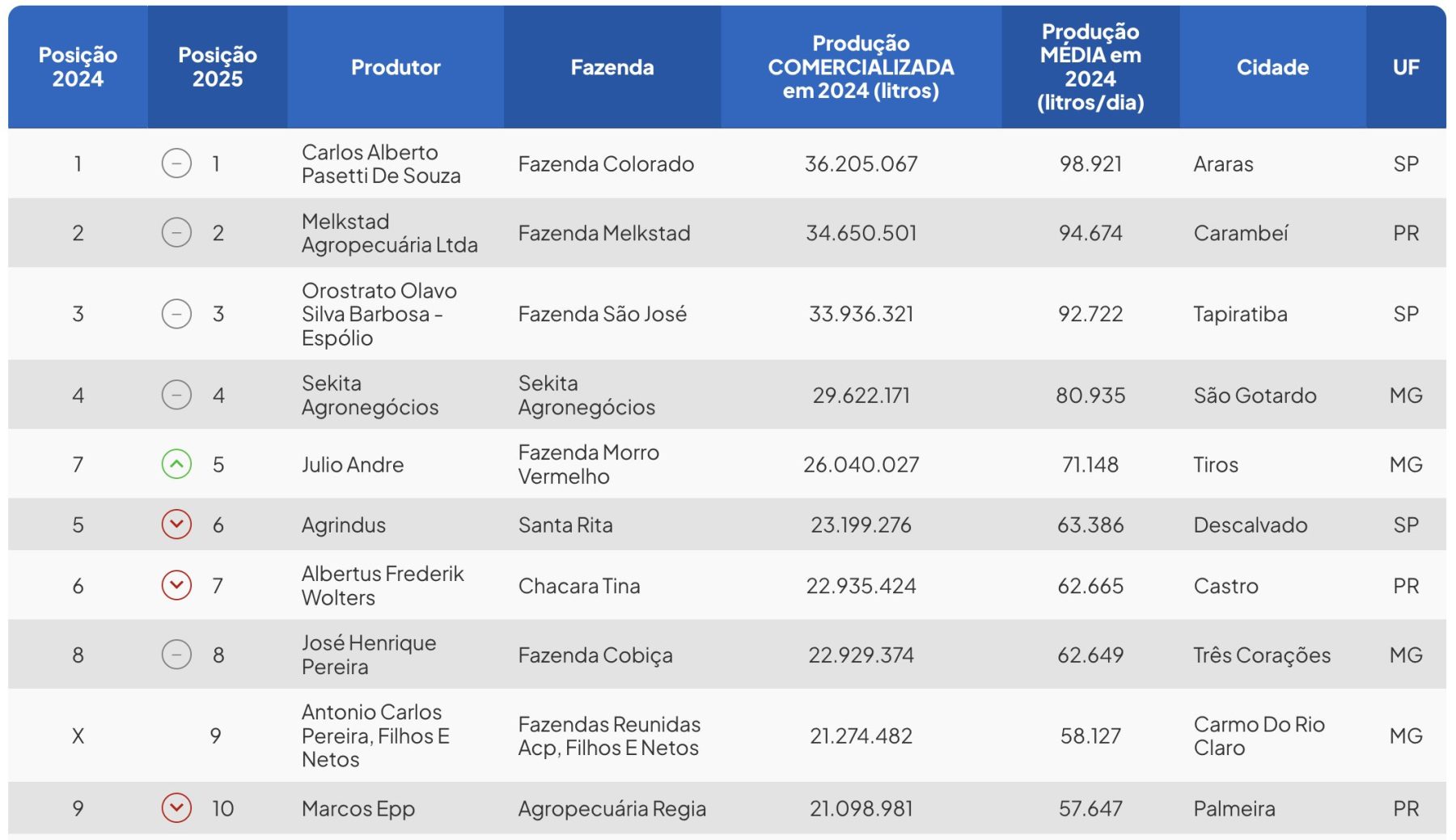 A região Sudeste concentra 51,3% da produção total do ranking, somando mais de 611 milhões de litros. Minas Gerais também se destaca por ser o estado de origem de cinco das dez propriedades que mais aumentaram a produção entre 2023 e 2024.