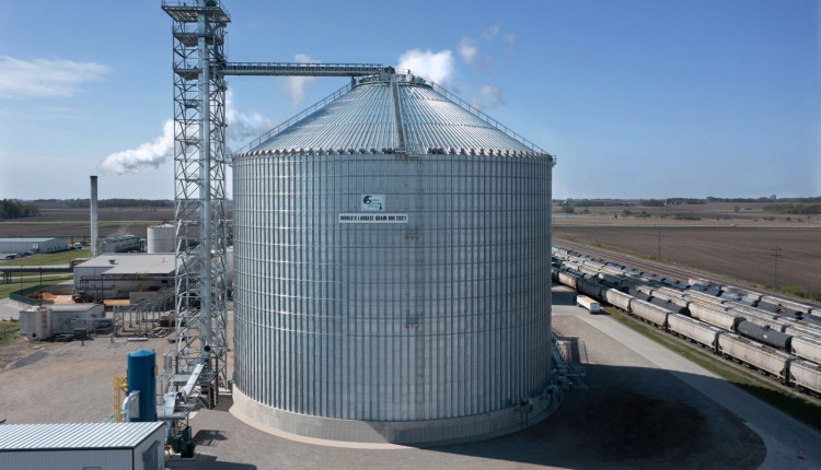 O silo, finalizado em 2021, tem 50,3 metros de diâmetro e 47,4 metros de altura. Ele armazena cerca de 2,25 milhões de bushels de milho seco – o suficiente para movimentar por semanas a operação de uma planta de etanol de grande porte.