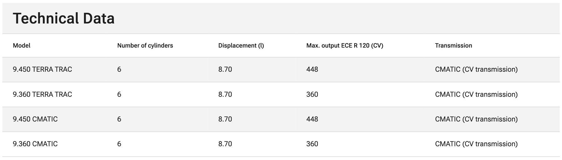 O Claas Axion 9.450 Terra Trac é equipado com motor de 6 cilindros, 8,7 litros de deslocamento e potência máxima de 448 cavalos, aliado a um torque de 1.850 Nm. A tração é garantida pelas esteiras TERRA TRAC e pela transmissão continuamente variável CMATIC, que distribui a força do motor de forma suave e inteligente.