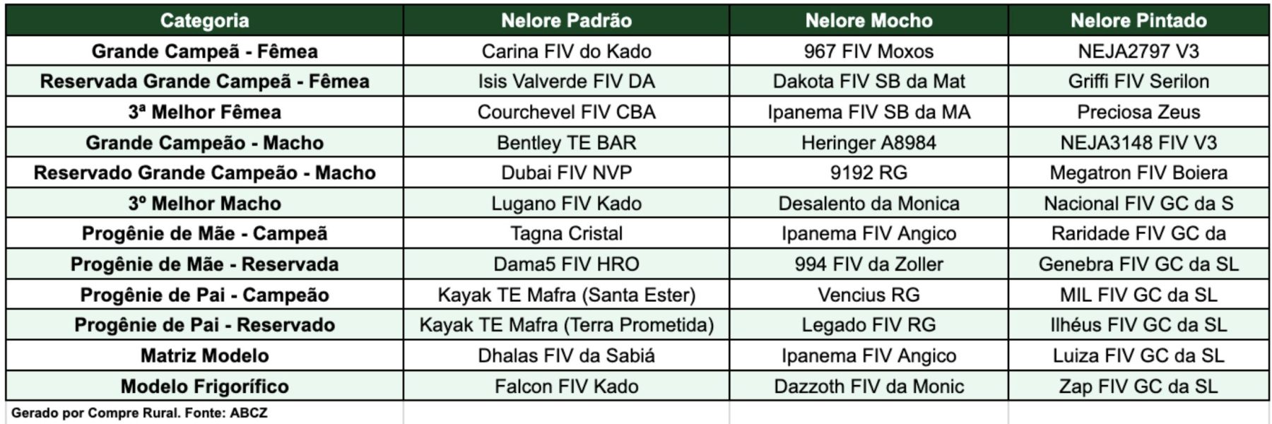 📊 Tabela geral com os Grandes Campeões e Campeãs da 90ª ExpoZebu das raças Nelore, Nelore Mocho e Nelore Pintado: