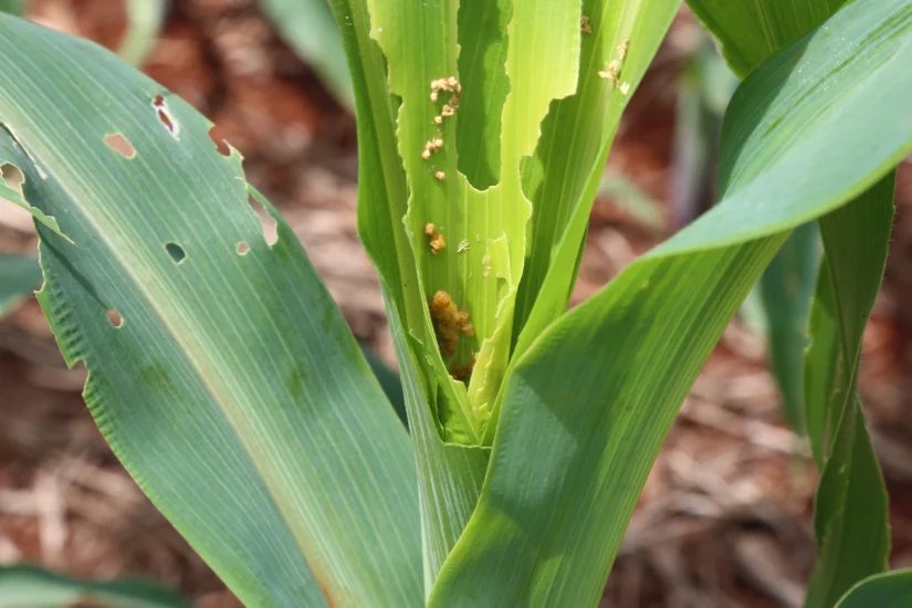 - Milho : Os ataques são mais frequentes em estágios iniciais ( V4 a V6 ) e durante a fase de enchimento de grãos , causando o abortamento das espigas e comprometendo o desenvolvimento do grão. Em áreas severamente infestadas, a produtividade pode cair até 18% , aumentando os custos de controle em até 10% .