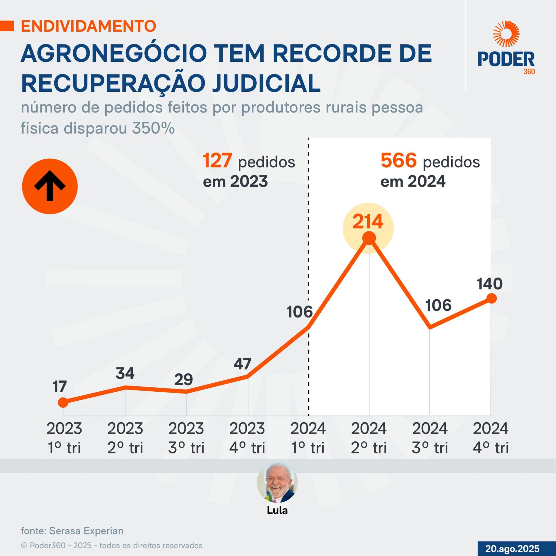 - queda nos preços das commodities agrícolas – a saca de soja, por exemplo, que em 2022 chegou a R$ 200, foi cotada em R$ 92 em 2025, segundo o advogado Eduardo Berbigier, em entrevista ao Poder360;