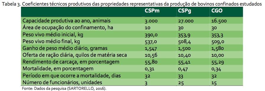 No levantamento os confinadores foram entrevistados pelo pesquisador sobre as características do seu sistema produtivo por meio de um questionário. Essas informações serviram de subsídios para delinear as propriedades representativas, ou seja, os custos apresentados neste informativo representam o confinamento com as características mais comuns da amostra e não uma propriedade em específico. Os coeficientes técnicos levantados foram descritos na Tabela 3, os quais serão atualizados regularmente para acompanhar a evolução tecnológica da atividade.