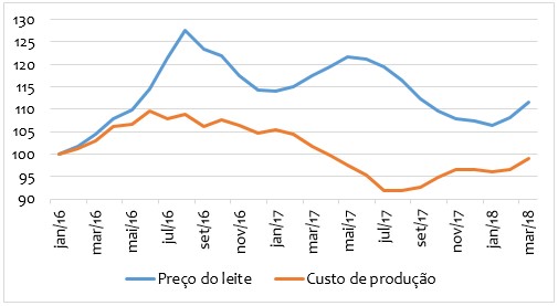 Figura 1. Preço do leite ao produtor versus custos de produção da pecuária leiteira, base 100= janeiro de 2016.
