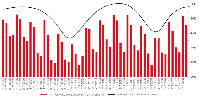 Figura 1. Participação das fêmeas no abate trimestral total (%), 2005 a 2018.