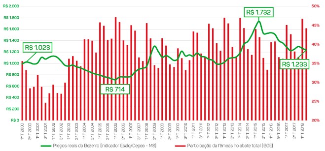 Figura 2. Participação das fêmeas no abate trimestral total (%) e evolução dos preços do bezerro (valores reais – média trimestral), 2000 a 2018.