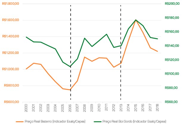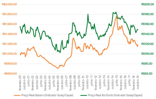 Figura 3. Indicador Esalq/BM&F Bovespa do Bezerro e do Boi Gordo, média mensal, em valores reais, 2000 a 2018.