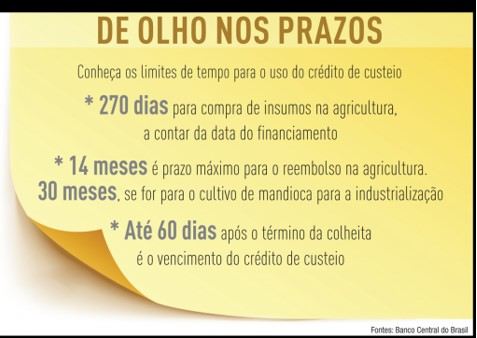 O prazo máximo de reembolso do crédito de custeio é de 14 meses para a agricultura, segundo o Manual de Crédito Rural (MCR). Para o ministro da Agricultura, Pecuária e Abastecimento, Blairo Maggi, são linhas como essa que fundamentam a produção agrícola do País.