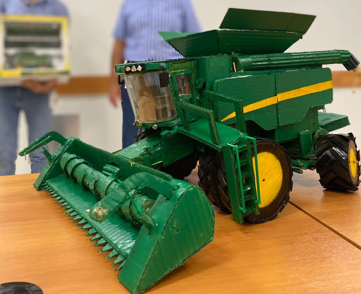 Era um dia comum na unidade de Patrocínio (MG) da Maqnelson, concessionário John Deere. Até que o local recebeu a visita de um rapaz com um equipamento bastante curioso. Com ele, um trator da John Deere – como os comercializados e assistidos no local. A máquina, porém, tinha proporções bem reduzidas e uma matéria-prima pra lá de inusitada: tratava-se de uma réplica de papelão.