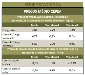 Apesar do recuo na média estadual, o frango inteiro congelado foi negociado no atacado da Grande São Paulo à média de R$ 6,65/kg em fevereiro, alta de 1,8% frente à de janeiro. Para o produto resfriado, na mesma comparação, a valorização foi de 0,8%, para a média de R$ 6,64/kg em fevereiro.