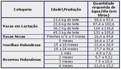 Consumo de água pela vaca varia conforme a matéria seca da ração ingerida, de acordo com a ingestão de proteínas, sal mineral, sal comum, idade dos animais, produção de leite, clima (sendo que, quanto maior a temperatura ambiente, maior o consumo de água).