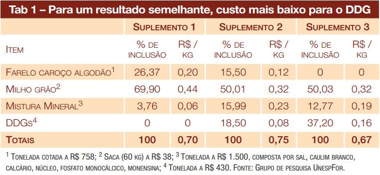 Um desses trabalhos vem sendo conduzido pela Unesp de Jaboticabal, em projeto financiado pela Fapesp (Fundação de Amparo à Pesquisa do Estado de São Paulo) e intitulado “Estratégias de manejo para redução dos impactos ambientais de sistemas de produção de gado de corte”. Sob orientação do professor Ricardo Reis, titular do Departamento de Zootecnia daquele campus, o doutorando em zootecnia Eliéder Prates Romanzini conclui que até o preço de R$ 430 por tonelada o DDG é “economicamente viável, em comparação com o suplemento utilizado outros ingredientes, quando substitui totalmente a fonte de proteína tradicional”.