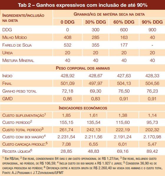 Resultado semelhante foi obtido em outro estudo, que serviu de tese de doutorado de Adriano Jorge Possamai, sob orientação do professor Joanis Tilemanhos Zervoudakis, da Faculdade de Veterinária da Universidade Federal do Mato Grosso. Também com animais de recria, mas desta vez no período seco do ano e com um percentual maior do peso corporal (de 0,4%) , com o DDG substituindo milho e farelo de soja.