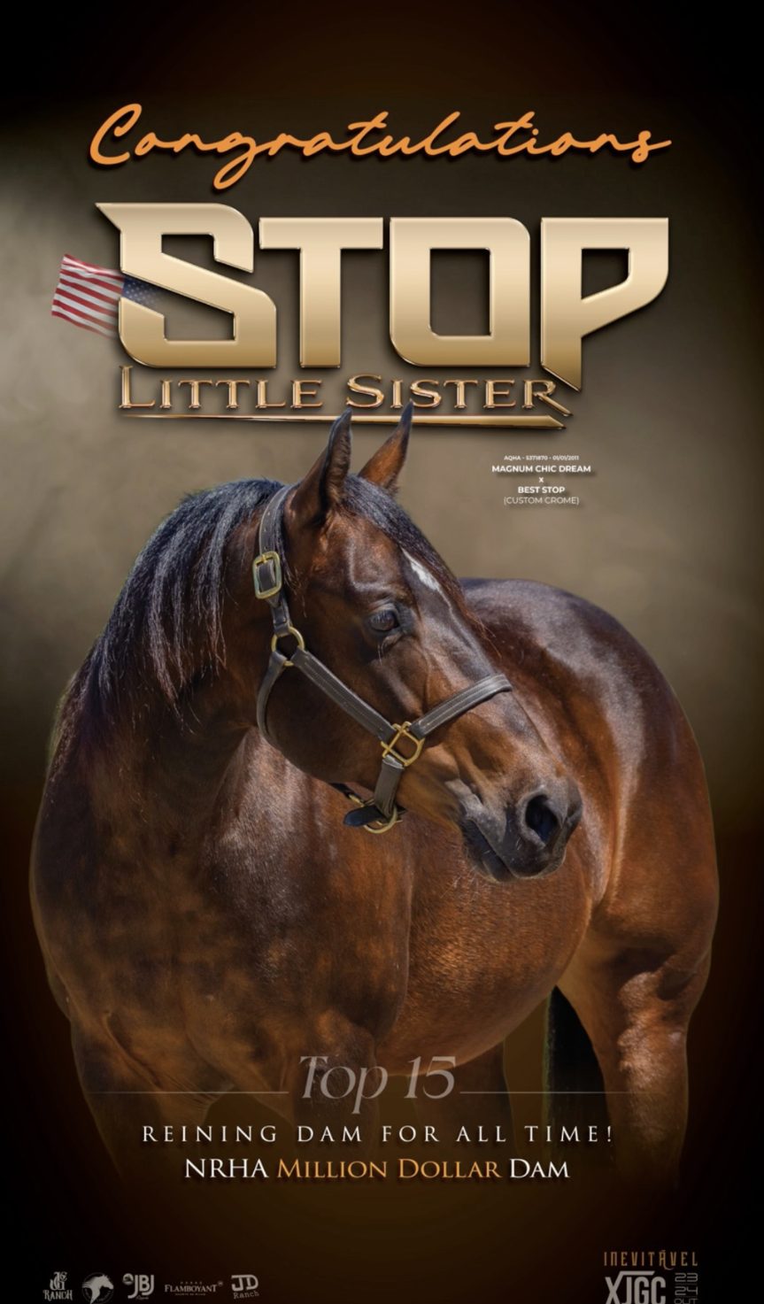 A história do Quarto de Milha mundial acaba de ganhar um novo capítulo escrito por criadores brasileiros. Stop Little Sister, uma das matrizes mais respeitadas da modalidade Rédeas, alcançou o título de Million Dollar Dam da NRHA (National Reining Horse Association), entrando no seleto grupo das éguas que ultrapassaram a marca de US$ 1 milhão em ganhos acumulados por seus filhos em competições oficiais.