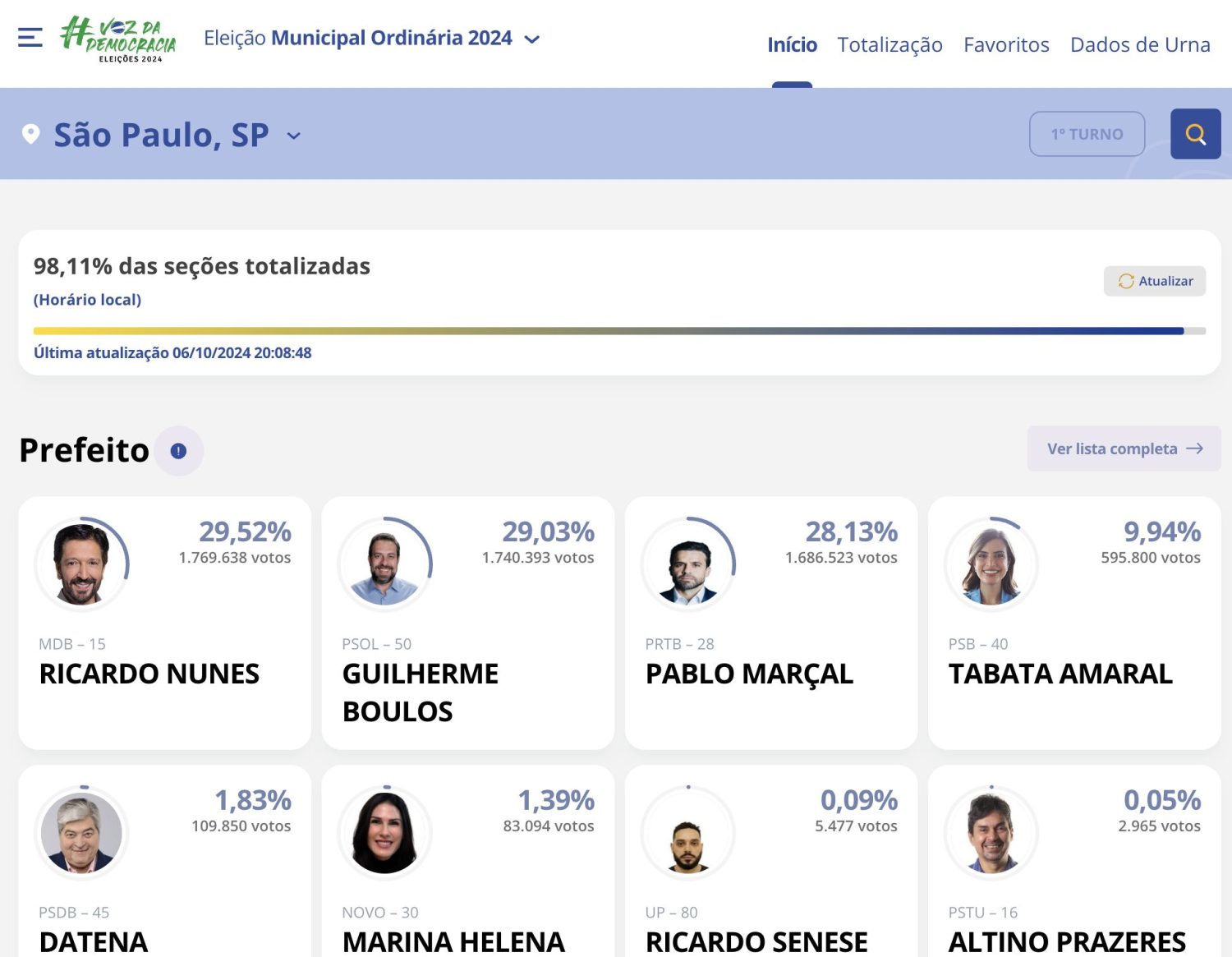 Na maior cidade do país, São Paulo, o candidato da centro-direita, Ricardo Nunes, conseguiu ficar em primeiro com uma margem apertada de votos, superando o candidato de esquerda, Guilherme Boulos, com 29,5% contra 29%. A capital paulista teve uma campanha polarizada, refletindo o clima político do país, com o segundo turno sendo disputado entre dois projetos de gestão bastante distintos.
