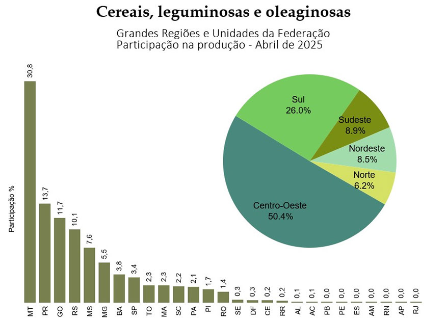 Entre as Grandes Regiões, o volume da produção de cereais, leguminosas e oleaginosas apresentou a seguinte distribuição: Centro-Oeste, 165,5 milhões de toneladas (50,4%); Sul, 85,3 milhões de toneladas (26,0%); Sudeste, 29,3 milhões de toneladas (8,9%), Nordeste, 28,1 milhões de toneladas (8,2%) e Norte, 20,2 milhões de toneladas (6,2%).
