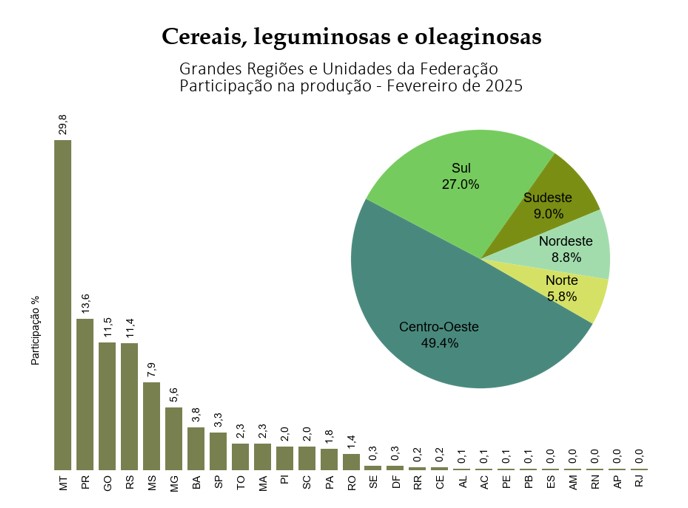 Mato Grosso lidera como o maior produtor nacional de grãos, com participação de 29,8%, seguido pelo Paraná (13,6%), Goiás (11,5%), Rio Grande do Sul (11,4%), Mato Grosso do Sul (7,9%) e Minas Gerais (5,6%), que, somados, representaram 79,8% do total. Com relação às participações regionais, tem-se a seguinte distribuição: Centro-Oeste (49,4%), Sul (27,0%), Sudeste (9,0%), Nordeste (8,8%) e Norte (5,8%).
