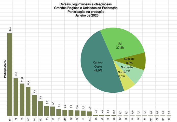 Entre as Grandes Regiões, o volume da produção de cereais, leguminosas e oleaginosas apresentou a seguinte distribuição: Centro-Oeste, 167,5 milhões de toneladas (48,9%); Sul, 95,3 milhões de toneladas (27,8%); Sudeste, 30,2 milhões de toneladas (8,8%), Nordeste, 28,2 milhões de toneladas (8,2%) e Norte, 21,5 milhões de toneladas (6,3%). A estimativa da produção de cereais, leguminosas e oleaginosas apresentou variação anual positiva para a Região Sul (10,4%) e a Nordeste (1,8%), e negativas para a Centro-Oeste (-6,2%), a Sudeste (-2,9%) e a Norte (-3,7%). Quanto à variação mensal, apresentaram crescimentos na produção a Região Sul (0,2%), a Norte (0,5%) e a Centro-Oeste (1,6%). A Sudeste apresentou estabilidade (-0,0%) e a Nordeste teve declínio (-0,4%).