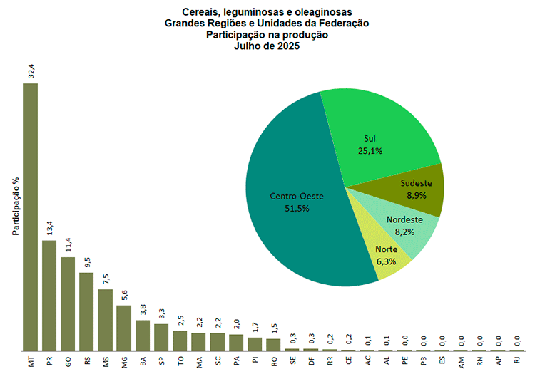 Entre as Grandes Regiões, o volume da produção de cereais, leguminosas e oleaginosas apresentou a seguinte distribuição: Centro-Oeste, 175,4 milhões de toneladas (51,5%); Sul, 85,4 milhões de toneladas (25,1%); Sudeste, 30,2 milhões de toneladas (8,9%), Nordeste, 28,1 milhões de toneladas (8,2%) e Norte, 21,3 milhões de toneladas (6,3%).
