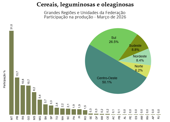 Entre as Grandes Regiões, o volume da produção de cereais, leguminosas e oleaginosas apresentou a seguinte distribuição: Centro-Oeste com 50,1%; Sul (26,5%); Sudeste (8,8%); Nordeste (8,4%) e Norte (6,2%).