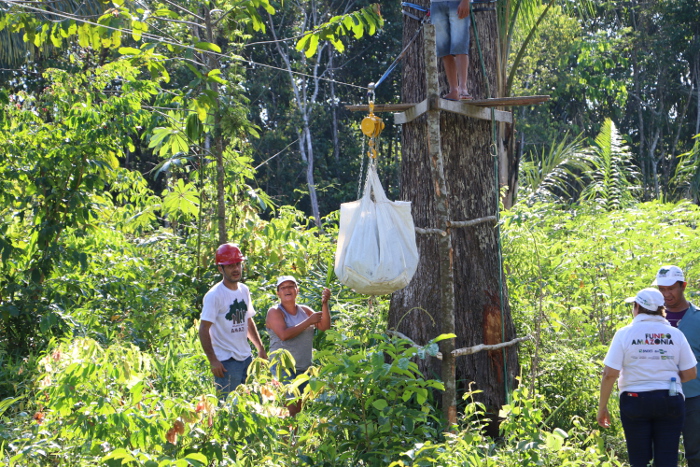 O curso realizado em Manicoré teve como um dos instrutores o escalador profissional de árvores, Fabiano Rodrigues Moraes, que também foi um dos parceiros no desenvolvimento do sistema. Segundo ele, o emprego de cabos aéreos é similar aos de uma tirolesa, geralmente empregado na forma de lazer para transportar pessoas. Para esse projeto, foram feitas algumas adaptações para transportar cargas pesadas, por trechos que podem chegar até 200 metros. “Para a implantação do sistema é preciso fazer um cálculo para saber uma inclinação correta para que a carga chegue de forma segura e que facilite a colocação e a retirada das castanhas transportadas”.